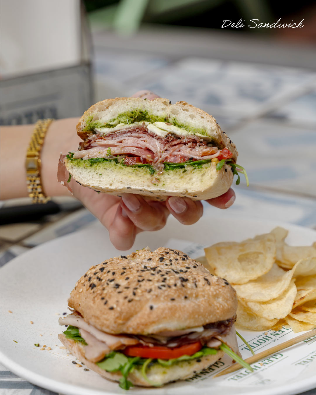 Stacked inside House Baked Turkish Bread, combining Double Smoked Leg Ham, Wild Vension Botanical Gin Salami, Smoked Buffalo Mozzarella, Rocket, Tomato and Pickled Mayo, finished with Pesto Mayo and a side of Sea Salt Crisps.