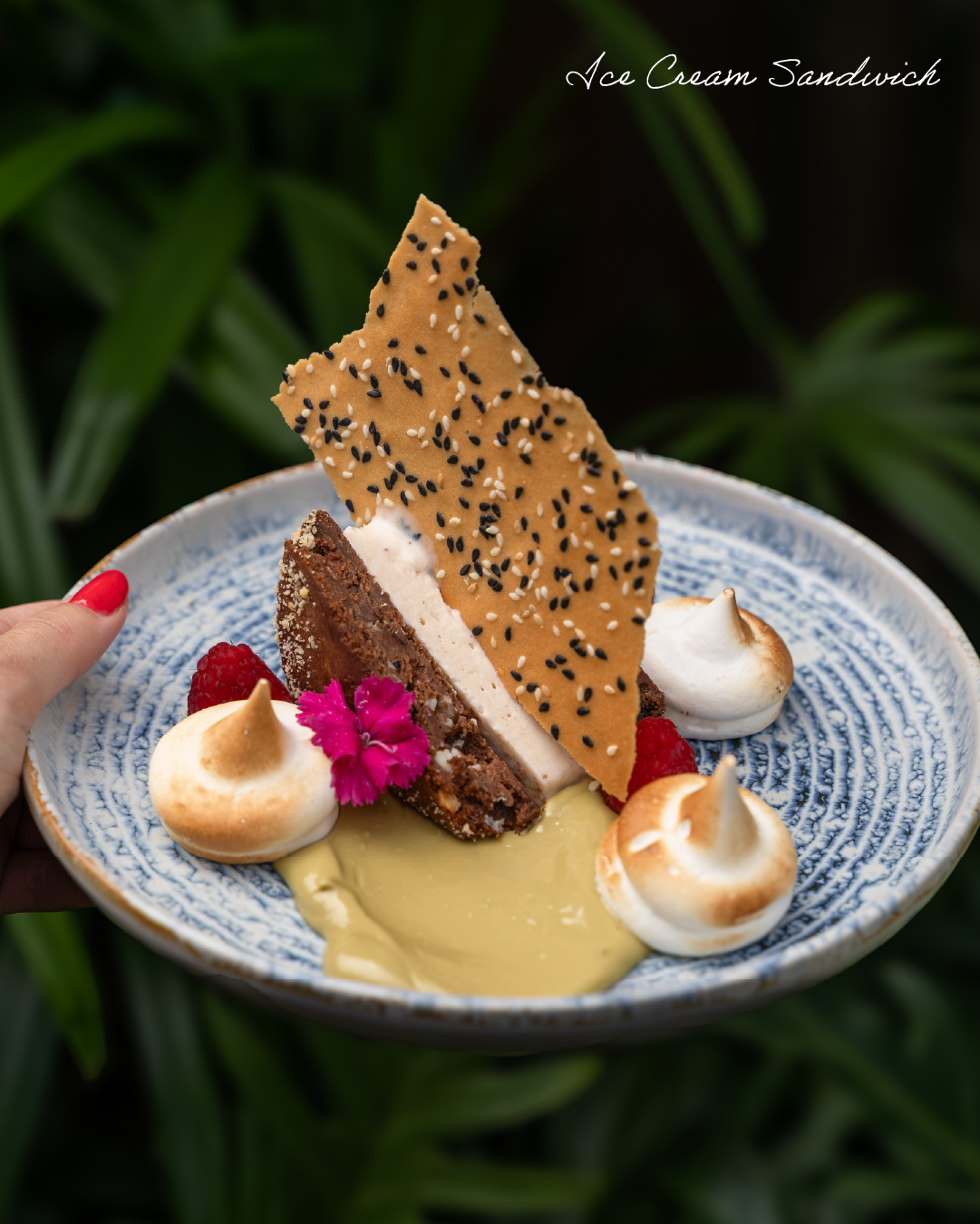 A rich Chocolate Brownie topped with Salted Caramel Parfait, Toasted Peanuts, Raspberry & Strawberry Jelly Jam, Pistachio Spread and Raspberries, finished with Meringe and a Sesame Crisp.